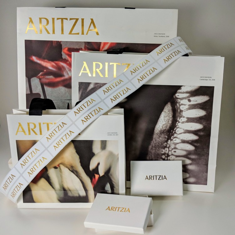 Aritzia Holiday Folding Gift Boxes with Gold Hotstamp Logo, Sticker Labels and Ecomm Paper Gusset Insert Bag ApparelE-Commerce Bags – PaperBoxes – FoldingStickers & Labels